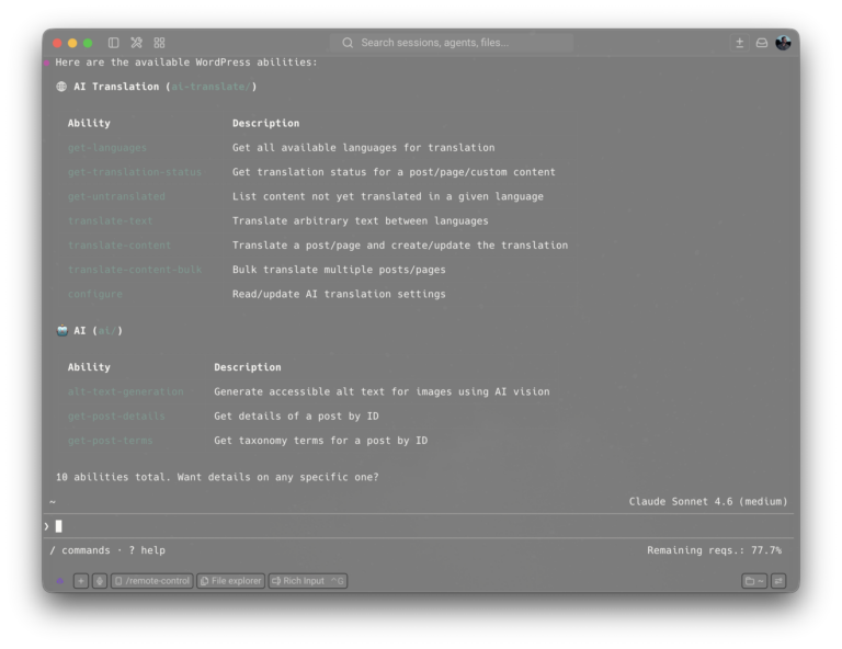 With the MCP setup, I hardly have to open the WordPress backend for translation tasks anymore. The AI assistant knows the available abilities, can combine them, and respond to natural language requests.