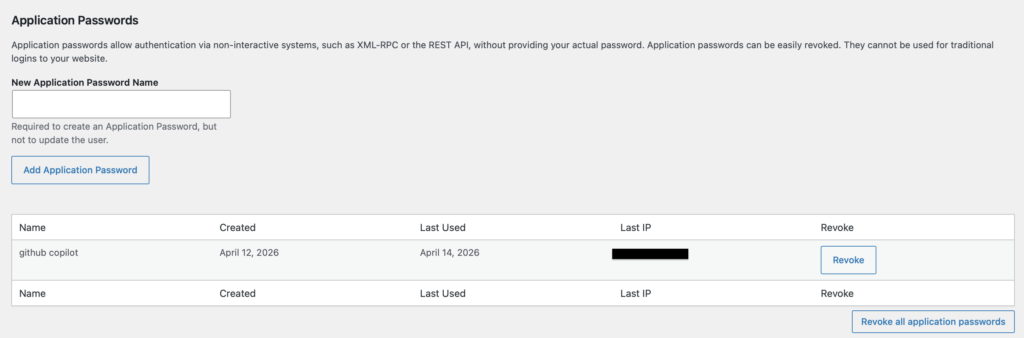 The MCP client needs access to WordPress. For this, I use Application Passwords – this is the most secure method because the password is restricted to a user and (optionally) specific permissions.